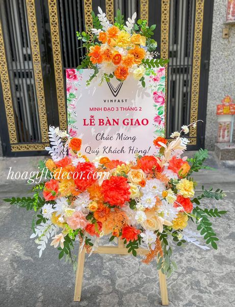 Kệ hoa thường là kệ gỗ cao 1,5m, bảng in 65cm x 55cm, kệ tính cả bảng in cao 1,7m. Bảng in thiết kế theo yêu cầu thương hiệu. Kệ được thiết kế phối hợp hoa lụa cao cấp theo phong cách hiện đại, giúp buổi lễ bàn giao xe thêm long trọng và chuyên nghiệp.